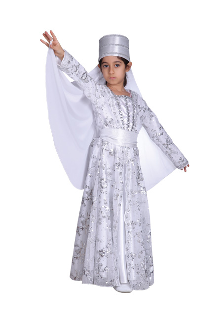 Kafkas yöresi kız çocuk kostümü(Uzun işlemeli);Başlık(Fes,sutaşı monteli),beyaz şifon pelerin,beyaz saten uzun elbise,Beyaz üstü gümüş işleme kumaştan elbise-kaftan,saten kemer.